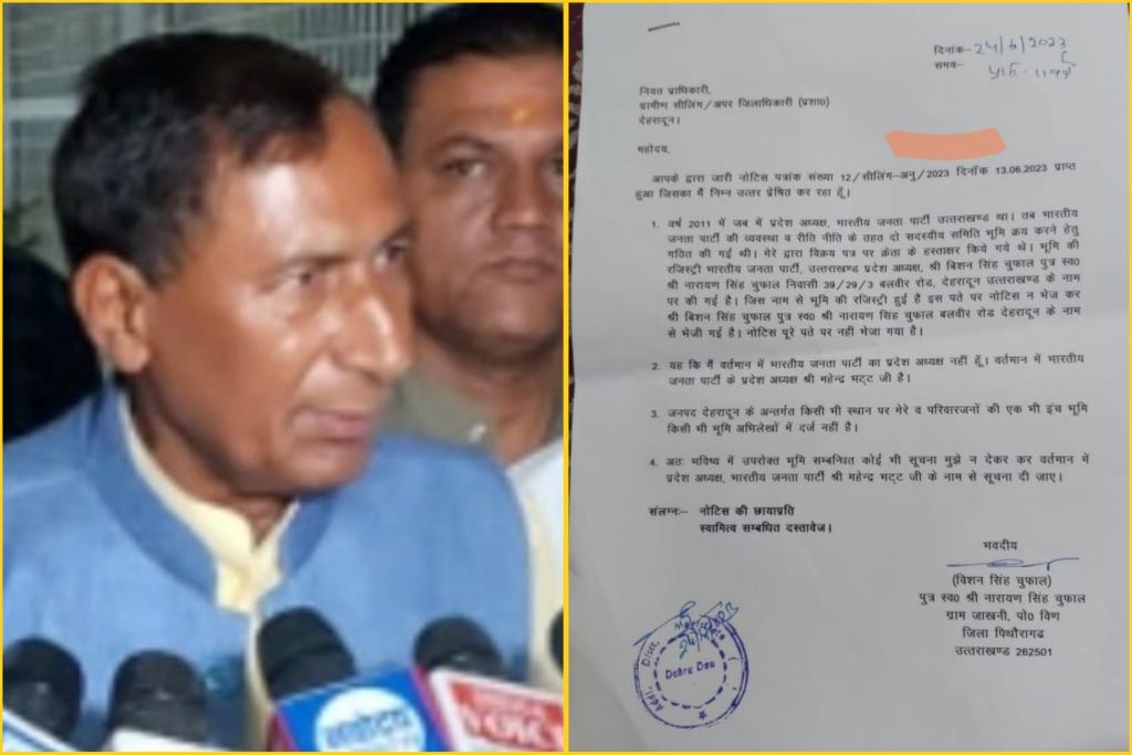 वर्ष 2011 में जब में प्रदेश अध्यक्ष, भारतीय जनता पार्टी उत्तराखण्ड था तब भारतीय जनता पार्टी की व्यवस्था व रीति नीति के तहत दो सदस्यीय समिति भूमि क्रय करने हेतु गठित की गई थी। मेरे द्वारा विक्रय पत्र पर क्रेता के हस्ताक्षर किये गये थे। भूमि की रजिस्ट्री भारतीय जनता पार्टी, उत्तराखण्ड प्रदेश अध्यक्ष बिशन सिंह चुफाल पुत्र स्व० नारायण सिंह चुफाल निवासी 39/29/3 बलवीर रोड, देहरादून उत्तराखण्ड के नाम पर की गई है। जिस नाम से भूमि की रजिस्ट्री हुई है इस पते पर नोटिस न भेज कर श्री बिशन सिंह चुफाल पुत्र स्व० नारायण सिंह चुफाल बलवीर रोड देहरादून के नाम से भेजी गई है। नोटिस पूरे पते पर नहीं भेजा गया है।