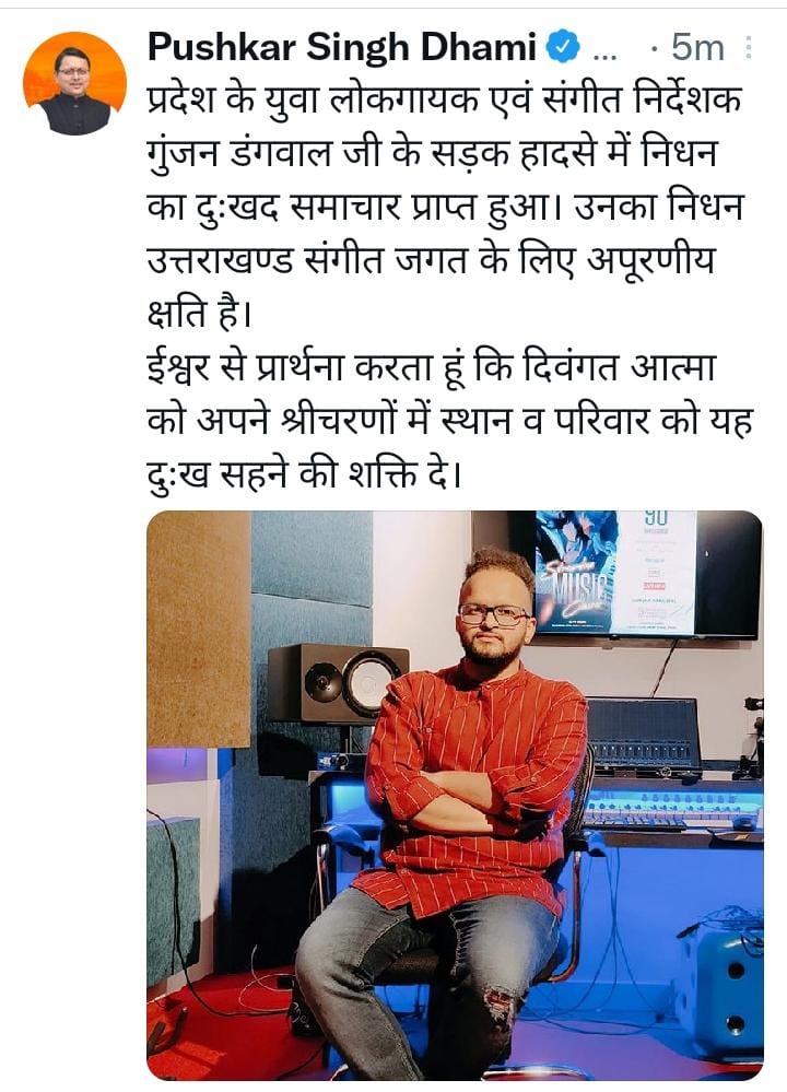 आज उत्तराखंड संगीत जगत के युवा एवं प्रतिभवान चेहरे गुंजन डंगवाल का चंडीगढ़ पंचकूला में एक भीषण सड़क हादसे में निधन हो गया है। वहीं मुख्यमंत्री पुष्कर सिंह धामी ने प्रदेश के युवा लोकगायक एवं संगीत निर्देशक गुंजन डंगवाल के सड़क हादसे में निधन पर गहरा दुःख व्यक्त किया है। उन्होंने ईश्वर से दिवंगत आत्मा की शांति तथा शोक संतप्त परिजनों को इस दुःख को सहन करने की शक्ति प्रदान करने की प्रार्थना की है।