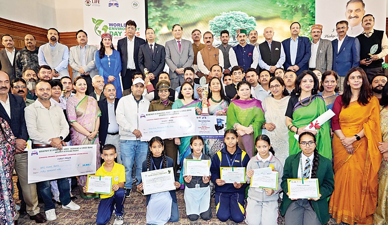 विश्व पर्यावरण दिवस के अवसर पर मुख्यमंत्री ठाकुर सुखविंदर सिंह सुक्खू ने गुरुवार को पर्यावरण संरक्षण के क्षेत्र में उत्कृष्ट योगदान के लिए आठ व्यक्तियों और संस्थाओं को पर्यावरण उत्कृष्टता पुरस्कार वितरित किए। पुरस्कार समारोह शिमला के होटल पीटरहॉफ में आयोजित किया गया। प्रथम और द्वितीय पुरस्कार के लिए 50-50 हजार रुपए जबकि तृतीय पुरस्कार के लिए 25 हजार रुपए की नकद राशि प्रदान की गई। शैक्षणिक संस्थान श्रेणी में राजकीय कन्या महाविद्यालय आरकेएमवी शिमला को प्रथम पुरस्कार दिया गया। अन्य प्रथम पुरस्कार विजेताओं में नेचर पार्क बाखली देवीदड़ और जाइका समर्थित परियोजना नाचन, मैसर्स पिडिलाइट इंडस्ट्रीज लिमिटेड, बद्दी हिमकॉस्ट के तहत सेंटर फॉर साइंस लर्निंग एंड क्रिएटिविटी बद्दी तथा खंड विकास कार्यालय, चौपाल शामिल हैं। द्वितीय पुरस्कार हिमालयन रिसर्च गु्रप शिमला, पीएम श्री राजकीय आदर्श वरिष्ठ माध्यमिक पाठशाला चौंतड़ा, मंडी और मैसर्स ल्यूमिनस पावर टेक्नोलॉजिज प्राइवेट लिमिटेड अंब जिला ऊना को दिया गया।