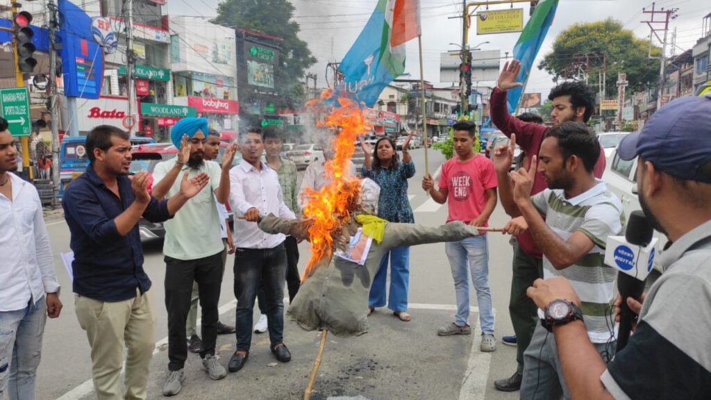 आज भारतीय राष्ट्रीय छात्र संगठन ने एसले हाल में केंद्रीय मंत्री स्मृति ईरानी का पुतला दहन किया। इस अवसर पर एनएसयूआई नेता अंकित बिष्ट का कहना है कि भाजपा महंगाई और बेरोजगारी जैसे मुद्दों से जनता का ध्यान भटकाकर इन बातों पर तूल दे रही है। उन्होंने कहा कि सोनिया गाँधी ने हमेशा संवैधानिक संस्थाओं का सम्मान किया है और द्रौपदी मुर्मू जी हम सभी की सम्मानित राष्ट्रपति हैं और हम उनका आदर करते हैं। लेकिन कल जो संसद में स्मृति ईरानी की ओर से जिस लहज़े में सोनिया गांधी को कहा गया उससे हम सभी एनएसयूआई और कांग्रेस के कार्यकर्ता आहत हैं। केंद्रीय मंत्री का कांग्रेस की अध्यक्ष सोनिया गांधी के साथ अमर्यादित व्यहवार करना व साथ ही अपमानजनक शब्द कहना सोनिया गांधी भाजपा की एक सांसद रमा देवी से बात कर रही थी स्मृति ईरानी ने सोनिया गांधी को घेरकर बड़े ही अपमानजनक लहजे में उनको अपशब्द कहे सोनिया गांधी ने उनसे शालीनता से कहा की में आपसे बात नहीं कर रही में दूसरी सांसद से बात कर रही हूँ तो स्मृति ईरानी चिल्लाकर बोली you Don’t know me, who I am केंद्रीय मंत्री के इस अमर्यादित व्यहवार को एनएसयूआई किसी भी रूप में स्वीकार नहीं करती तथा उनसे मांग करती है कि वे कांग्रेस अध्यक्ष श्रीमती सोनिया गांधी जी से माफी मांगे। इस अवसर पर कविता माही, मनोज राम कोठियाल, अमन, हरजोत सिंह, सागर पुंडीर, भव्या , हरीश जोशी, काजल सहगल, सुजल सोनकर, सचिन, आदि उपस्थित रहे।