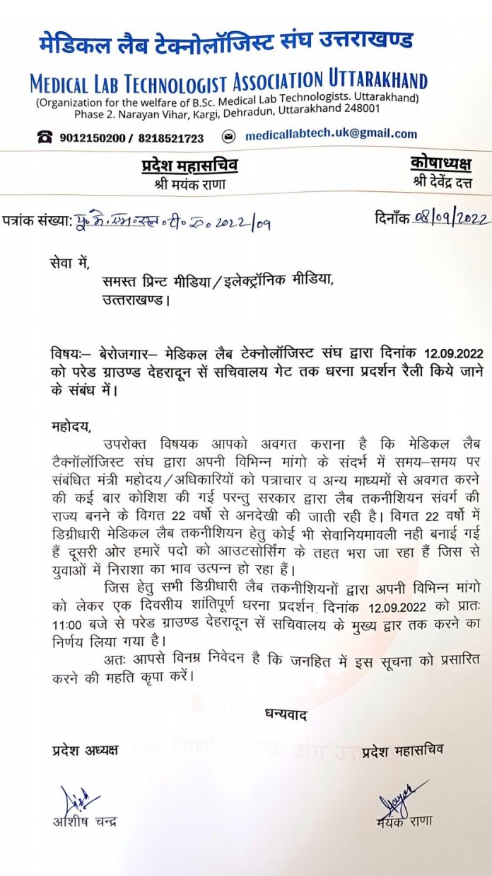 12 सितंबर को प्रदेश भर के मेडिकल लैब टेक्नोलॉजिस्ट संघ सरकार के खिलाफ उतरेगा सड़कों पर
