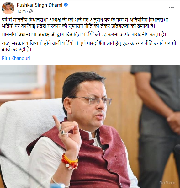 वहीं सीएम धामी ने कहा कि पूर्व में माननीय विधानसभा अध्यक्ष जी को भेजे गए अनुरोध पत्र के क्रम में अनियमित विधानसभा भर्तियों पर कार्रवाई प्रदेश सरकार की सुशासन नीति को लेकर प्रतिबद्धता को दर्शाता है। माननीय विधानसभा अध्यक्ष जी द्वारा विवादित भर्तियों को रद्द करना अत्यंत सराहनीय कदम है राज्य सरकार भविष्य में होने वाली भर्तियों में पूर्ण पारदर्शिता लाने हेतु एक कारगर नीति बनाने पर भी कार्य कर रही है।